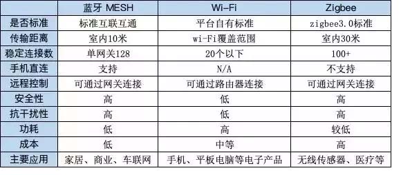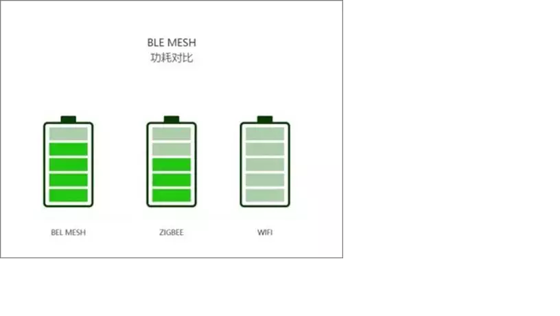 從設備傳輸功耗來看,BLE Mesh功耗最低,Zigbeb功耗略高于BLE Mesh,Wi-Fi由于是一項高速接入網(wǎng)絡的技術,功耗最大。