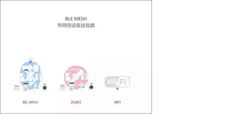 從單網(wǎng)絡設備連接數(shù)量來看,BLE Mesh主要用于建立多對多設備通信,支持設備的連接數(shù)最多,最適合智能家居場景中的多設備連接,是Wi-Fi的數(shù)倍以上。Zigbee支持設備連接數(shù)僅次于BLE Mesh,Wi-Fi支持設備連接數(shù)最少。