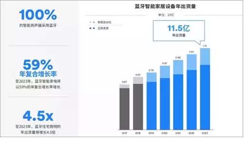 藍牙技術聯(lián)盟最新發(fā)布的《2019藍牙市場最新資訊》顯示,預計到2023年,藍牙智能家居設備出貨量將達到11.5億。其中,藍牙住宅照明設備的年出貨量將增長4.5 倍;藍牙智能家電將以59% 的年復合增長率增長。