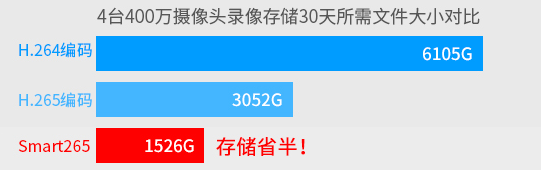 科技還在進(jìn)步,目前??翟貶.265的基礎(chǔ)上進(jìn)行算法優(yōu)化,推出了SMART.265,所占用內(nèi)存同H.265比較參考如下(約節(jié)省50%存儲(chǔ)空間):