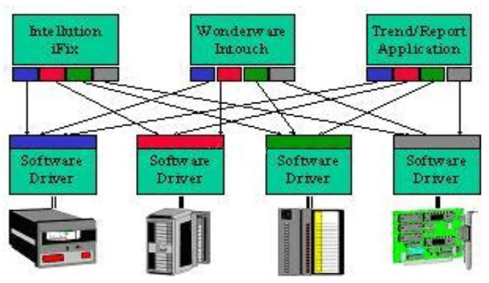 1.傳統(tǒng)技術(shù)與OPC技術(shù) 1.1傳統(tǒng)的過程控制系統(tǒng)結(jié)構(gòu) 傳統(tǒng)的過程控制系統(tǒng)是一對一的系統(tǒng),任何一種HMI等上位監(jiān)控軟件或其它應(yīng)用軟件,在使用某種硬件設(shè)備時都需要開發(fā)專用的驅(qū)動程序。