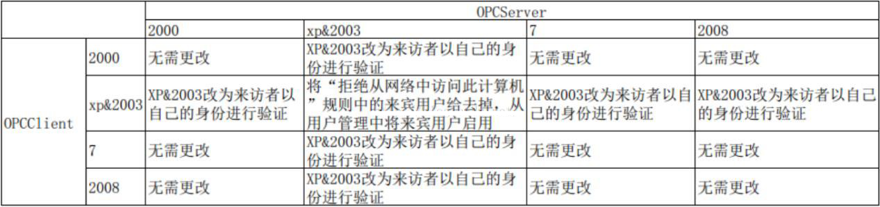 OPC Client和OPC Server配置的安全策略下表是對 OPC Client 和 OPC Server 所在操作系統(tǒng)之間的安全策略的配置對應(yīng)說明: