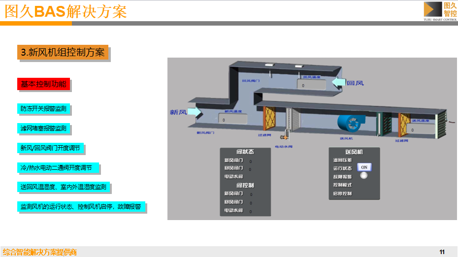 (1)空氣處理機(jī)組的監(jiān)控風(fēng)機(jī)控制:采用定時(shí)程序控制,累計(jì)運(yùn)行時(shí)間。溫度控制:夏季送冷風(fēng)、冬季送暖風(fēng)、春秋季節(jié)送新風(fēng)。濕度控制:根據(jù)回風(fēng)濕度調(diào)節(jié)加濕閥流量開度,控制蒸汽送給量。風(fēng)閥控制:根據(jù)室外溫度和回風(fēng)中CO2的焓值,調(diào)整風(fēng)閥開度。聯(lián)鎖控制:風(fēng)機(jī)啟停和冷/熱水電動閥、加濕閥、新風(fēng)風(fēng)閥、回風(fēng)風(fēng)閥實(shí)施聯(lián)動。參數(shù)監(jiān)測:送風(fēng)溫度、濕度,回風(fēng)溫度、濕度,室內(nèi)溫度,室外 溫度,手動/自動轉(zhuǎn)換,風(fēng)機(jī)運(yùn)行狀態(tài),電動水閥閥位反饋,加濕閥閥位反饋,過濾網(wǎng)壓差開關(guān),風(fēng)機(jī)壓差開關(guān),防霜凍保護(hù)開關(guān),室內(nèi)空氣質(zhì)量(CO2)等。報(bào)警功能:過濾網(wǎng)壓差超限(過濾網(wǎng)堵塞)報(bào)警、風(fēng)機(jī)故障報(bào)警、 防霜凍低溫報(bào)警、參數(shù)越限報(bào)警等。顯示打印:動態(tài)流程畫面、數(shù)據(jù)查詢、運(yùn)行曲線、送風(fēng)溫濕度、 回風(fēng)溫濕度、新風(fēng)溫濕度、閥位置顯示、故障報(bào)表、數(shù)據(jù)報(bào)表。