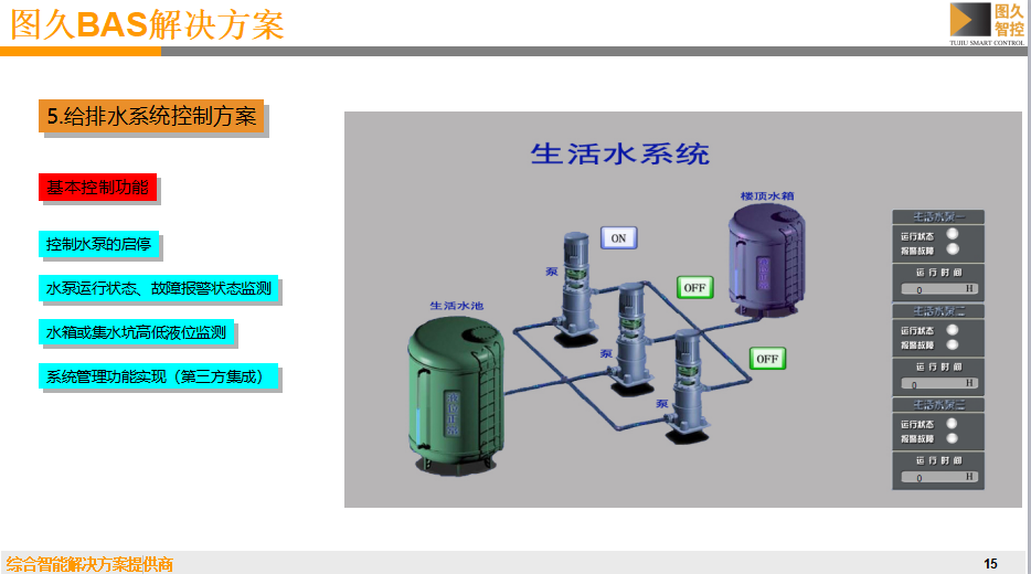 1、生活水泵控制:DDC完成對生活水泵的啟??刂啤⑦\(yùn)行狀態(tài)、故障報(bào)警信號的管理。自動實(shí)現(xiàn)恒壓控制、循環(huán)倒泵、備用替開等功能。