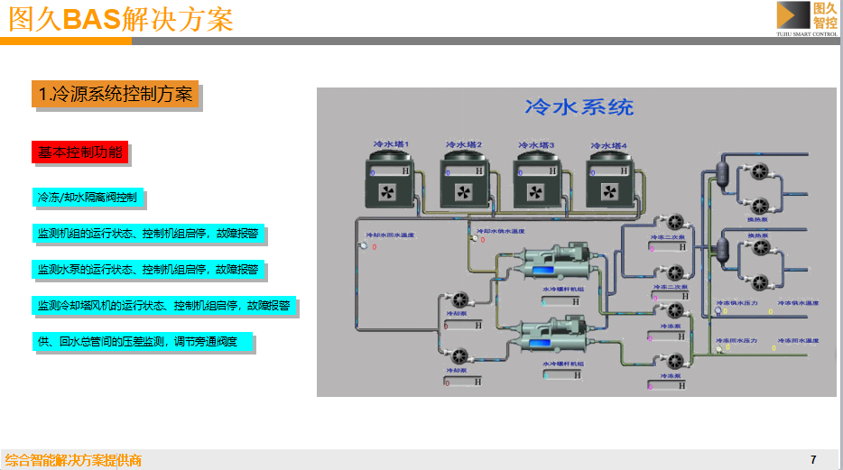 7、冷卻水溫度控制:將冷卻循環(huán)水供/回水總管上溫度差值的檢測 信號送入DDC,實(shí)時(shí)控制冷卻塔風(fēng)機(jī)的啟停和運(yùn)行臺數(shù)。